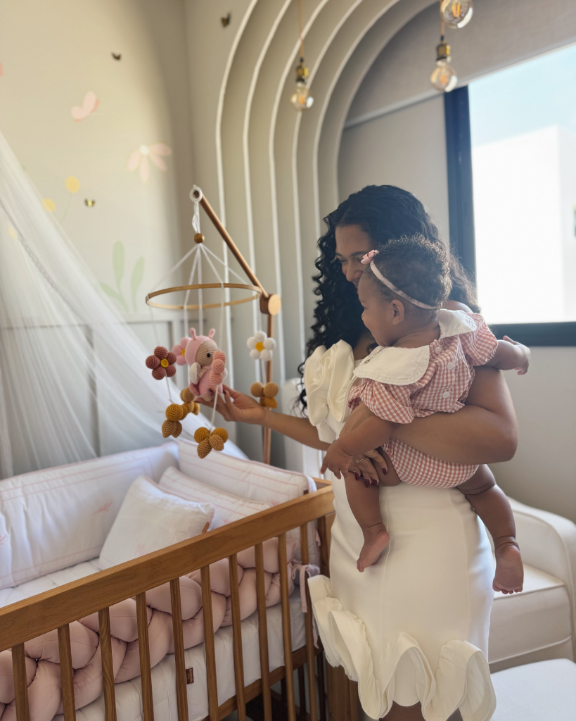 No “Jardim da Maya”, o berço e o móbile ocupam um lugar especial no coração da mamãe. Adrielle conta que, enquanto organiza as coisinhas no quarto, a Maya se diverte por horas observando os movimentos e cores do móbile. “É lindo ver como aquele cantinho transmite segurança e alegria, ali ela se sente realmente feliz e tranquila”, comenta.