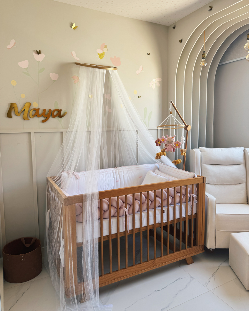 A inspiração para o quartinho da Maya não surgiu ao acaso. Adrielle sempre foi apaixonada por flores e borboletas, elementos que foram as estrelas do seu chá revelação. “Decidi que esse seria o tema do chá, um verdadeiro Jardim Encantado. A partir daí, nasceu a ideia para o quartinho dela”, revela. O objetivo era trazer toda a magia e suavidade daquele momento para o dia a dia da bebê, criando um ambiente onde ela pudesse crescer cercada de beleza e tranquilidade.